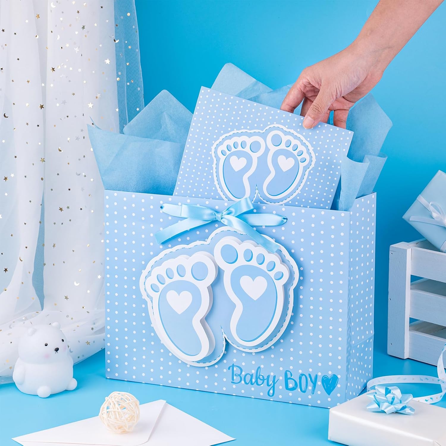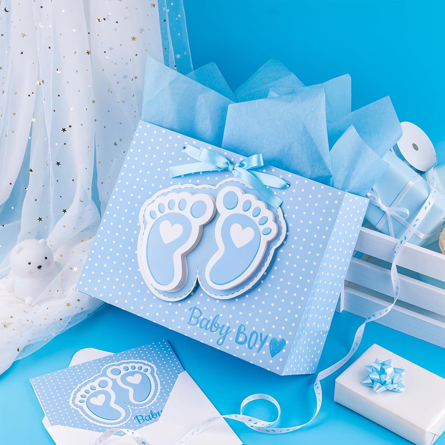 BABY SHOWER DESIGN: The blue gift bag features 3D paster design with pattern that shows a foot print and “baby boy” lettering. This gift bag bundle makes cheerful, varied gift presentation easy for celebrations like baby shower for baby boy.