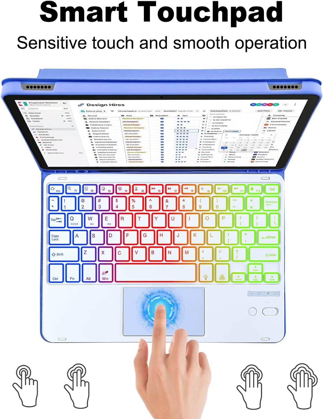 7 Colors Backlight + Touch Keyboard The keyboard has seven backlight colors to switch freely, making it easy to use in a dark environment, and can also adjust the backlight mode. The touchpad can replace the mouse to complete the operation, supports multi-finger gestures function, and improves office efficiency.