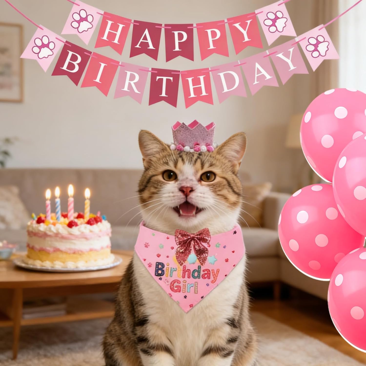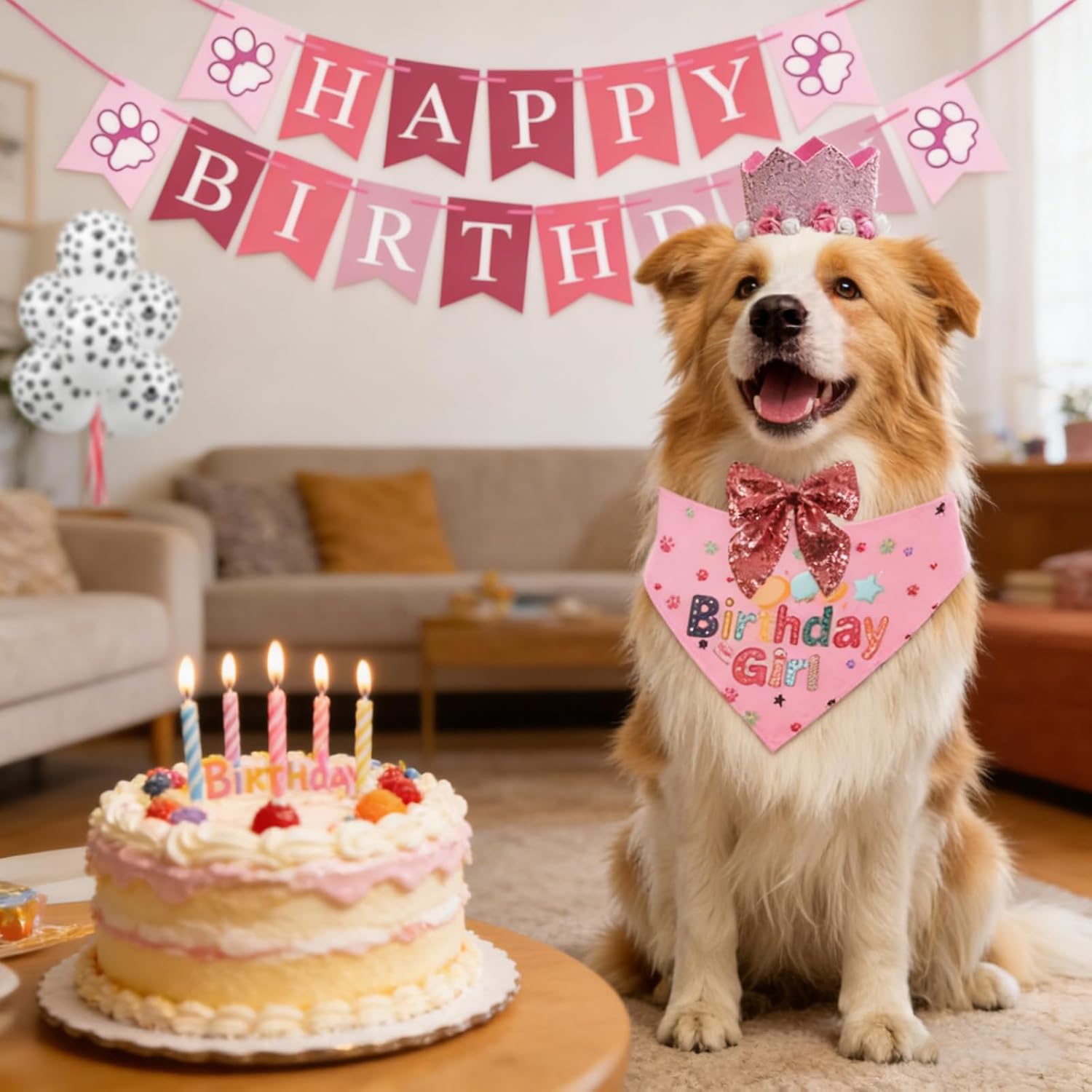 MINGBOLIN Dog Birthday Bandana Dog Birthday Hat with Adhesive Gold Numbers dog birthday Party Supplies Set Cotton Triangle Scarf Adjustable Pet Collar Bowtie present banner Paw Print Balloon (Pink)