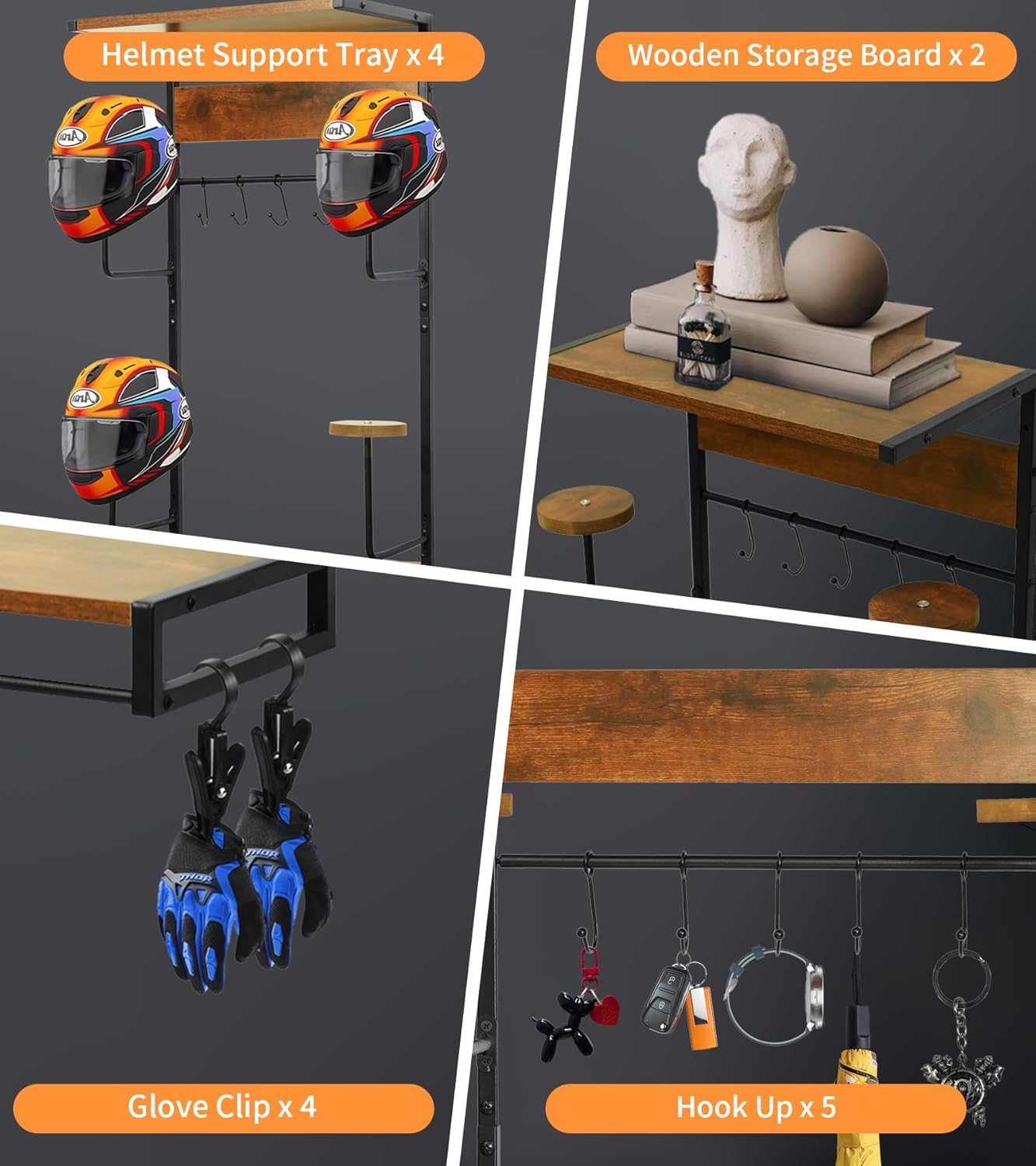 Versatile Storage for Assorted Motorcycle Accessories: With 4 helmet holders, 4 clips and 5 hooks, this helmet rack offers ample storage options for a variety of motorcycle accessories. Whether you need to store helmets, jackets, gloves, or other gear, this motorcycle helmet stand has you covered with its multi-functional storage solutions