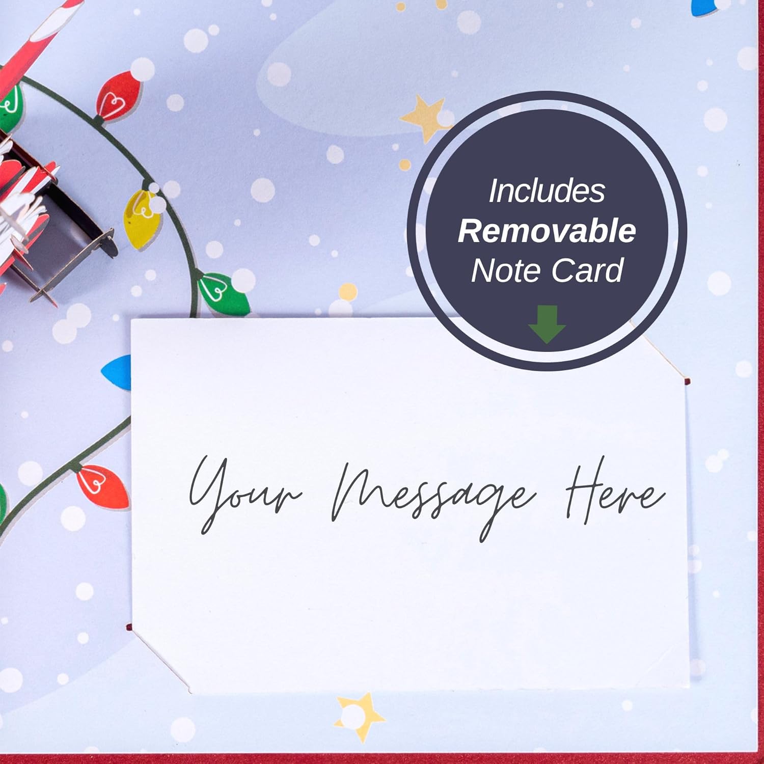 HANDMADE INTRICATE DESIGN-This lovely cute pop-up card features an exciting, unique, 3-d design bringing to life a dancing Santa as his sack lay aside. A memorable gift that can be kept as a keepsake.