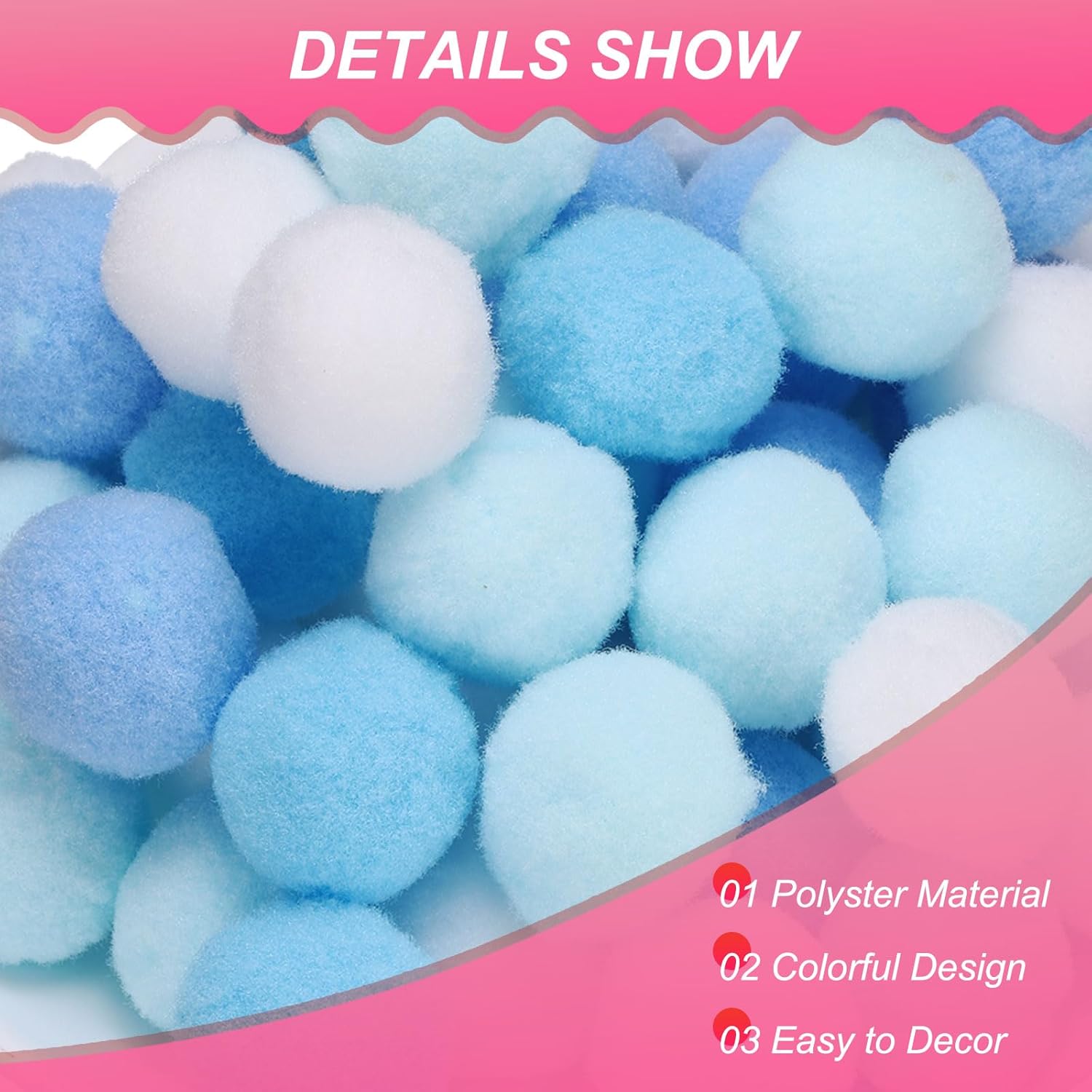 Advantage: Made from fuzzy polyester fiber, these pom poms are soft, lightweight, safe for DIY crafts and decorations.