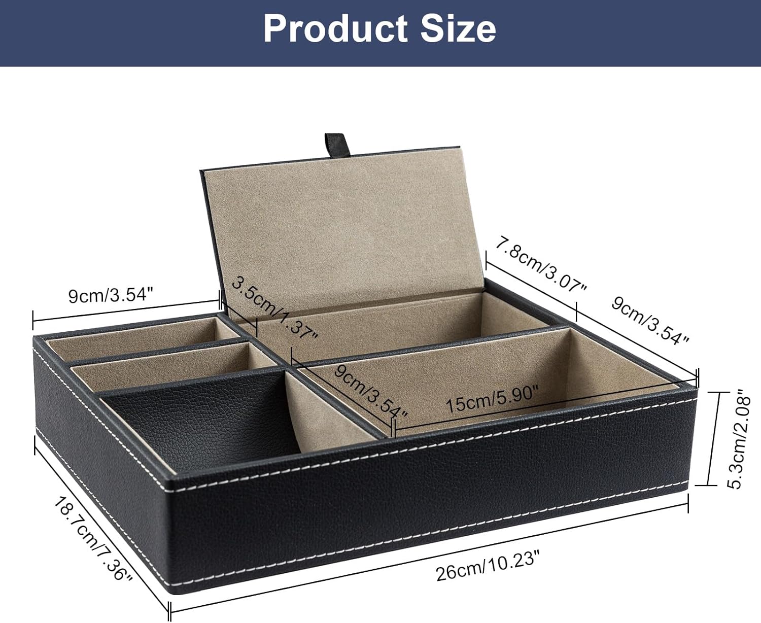 PU Leather Valet Tray Organizer 5-Compartment Nightstand & Desk Catchall for Men/Women Storage Box for Phone, Wallet, Keys, Jewelry, Watch, Sunglasses 26 x 18.7 x 5.3 cm (Black)