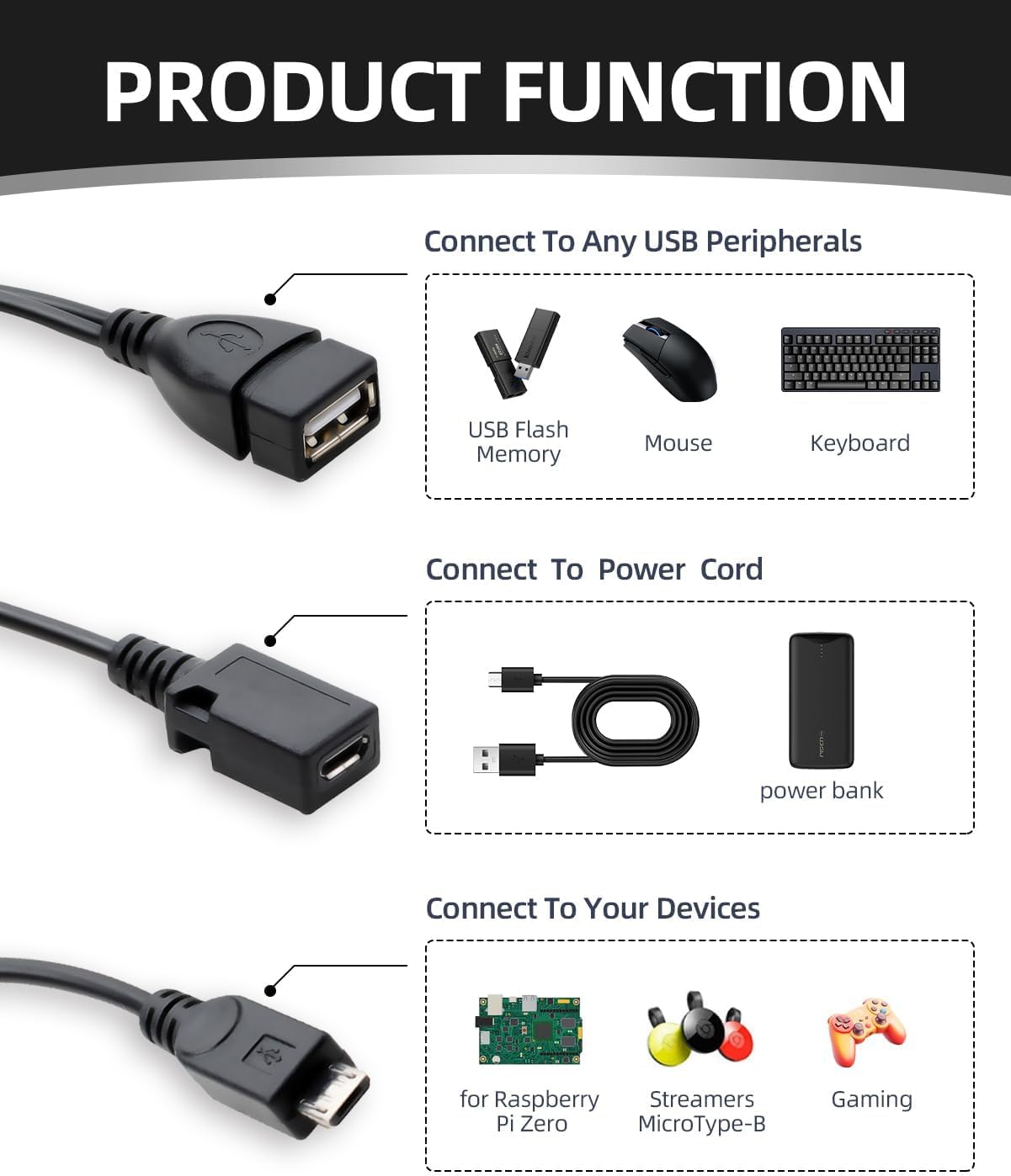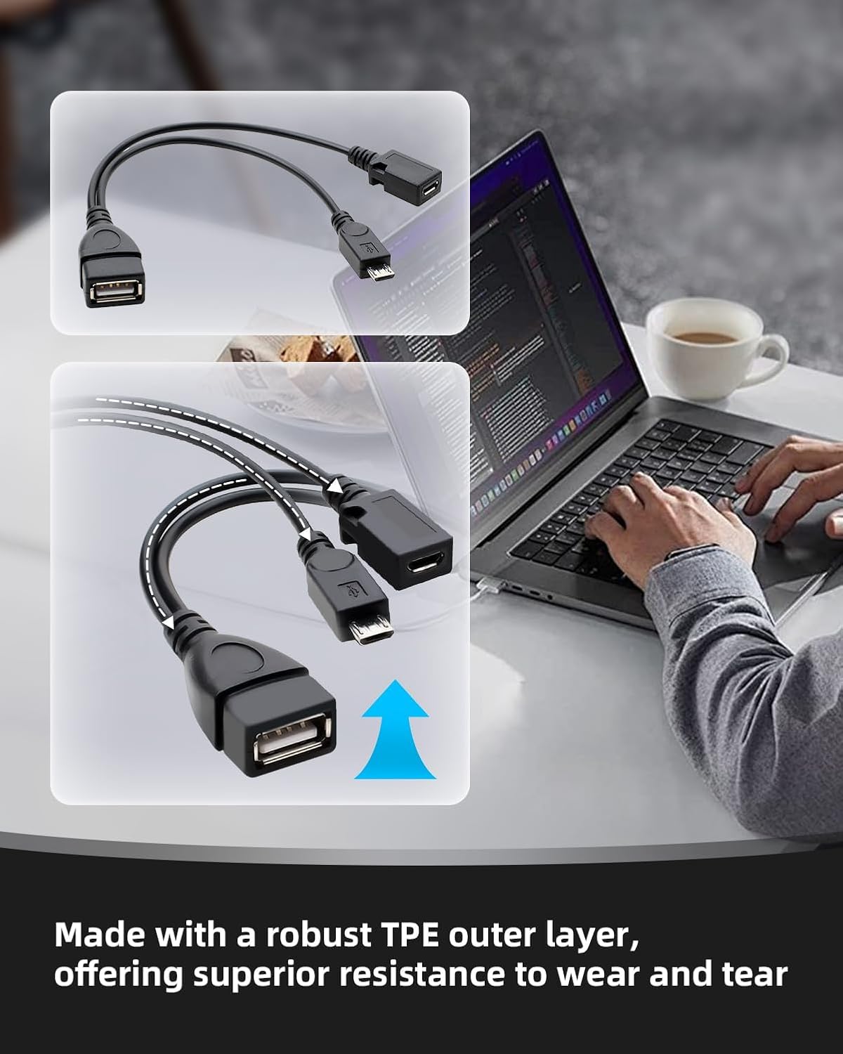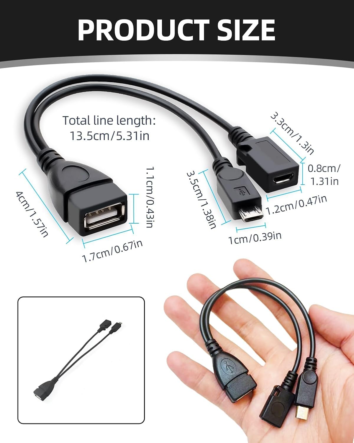 2-in-1 Design: With an 8 inch compact design, this otg adapter features both a micro USB male port for data transfer and a micro USB female port. The usb port otg adapter easily connect and power USB accessories without extra adapters, ensuring seamless performance