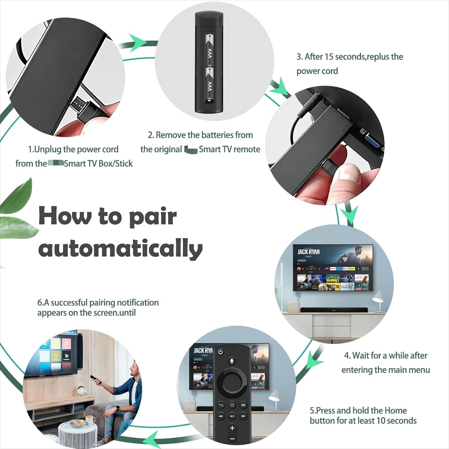 PAIRING IS EASY: Firstly, you need to remove the TV Stick from the TV and unplug the power supply from the TV Stick. Then re-plug the power and the stick into the TV. Then press the Home button for about 8-15 seconds until the LED starts flashing amber rapidly and the remote control will automatically pair with your device.