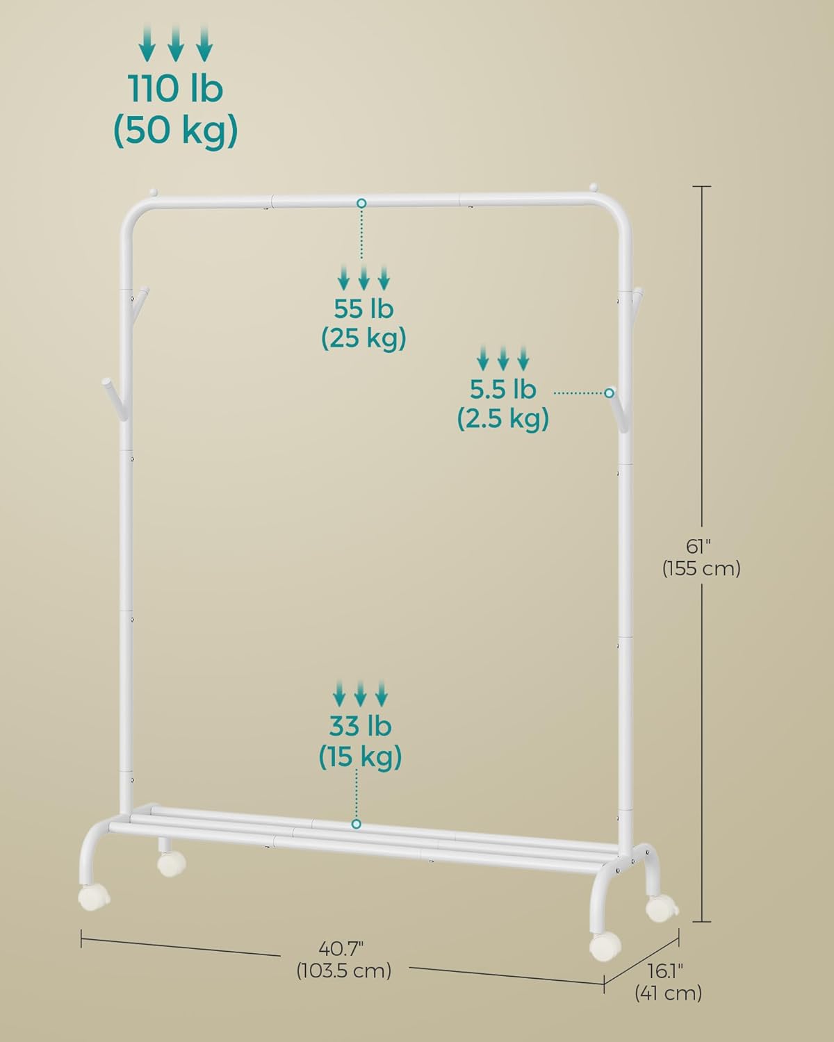 SONGMICS Clothes Rail, Clothes Rack, Single Clothes Hanging Rail, Heavy-Duty Metal Frame, with Wheels and Shelf, 50 kg Total Max. Load, 103.5 cm Wide, Clothing Storage, Cloud White HSR131W01