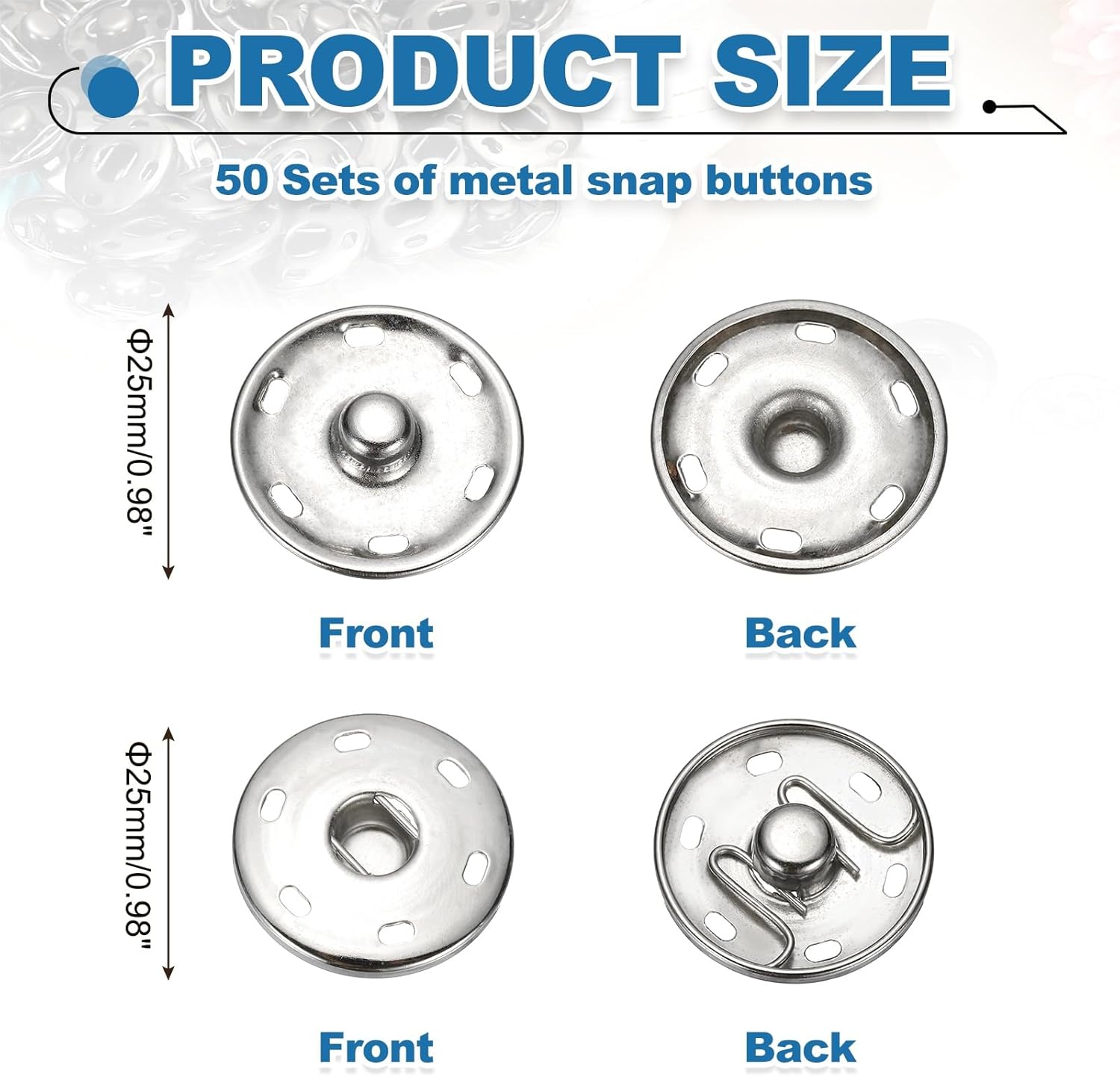 Package Includes: You will receive 50 Sets of metal snap buttons, each set contains 2 parts: 1 snap seat and 1 snap; Color: Silver Tone; Snap Diameter: 25 mm/0.98 inch; Snap Socket Diameter: 25 mm/0.98 inch