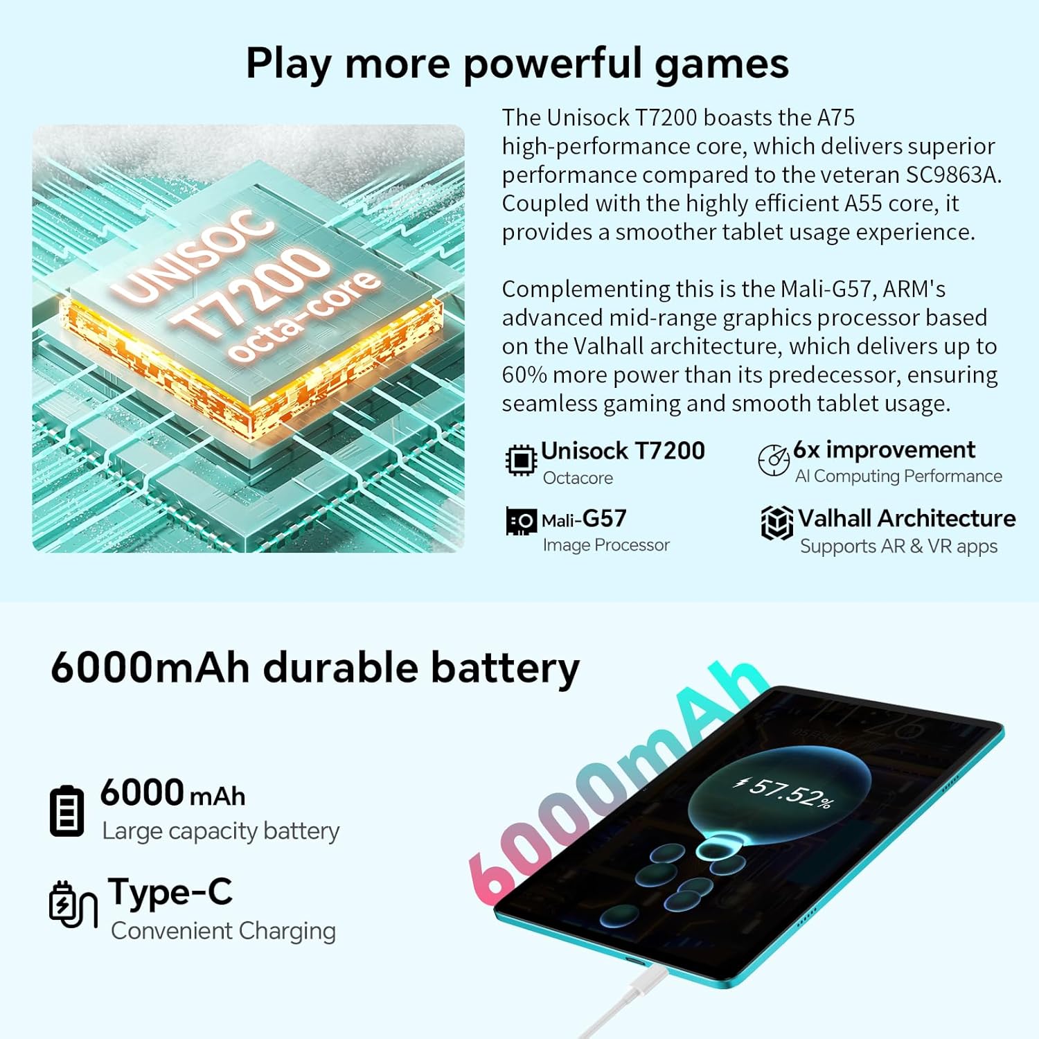 ✅【Tablet 10.1 inch + Light Body】Resolution 1280×800 IPS. T-colour 3.0 technologies for improved colour and image detail. The tablet using a 12nm process can effectively reduce heat generation while maintaining high performance. Uses a high-sensitivity G+G touch screen, a more precise touch experience.
