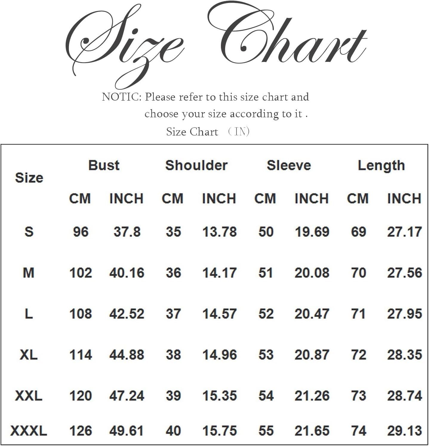 Size:XL Bust:114cm/44.88” Shoulder:38cm/14.96” Sleeve:53cm/20.87” Length:72cm/28.35”