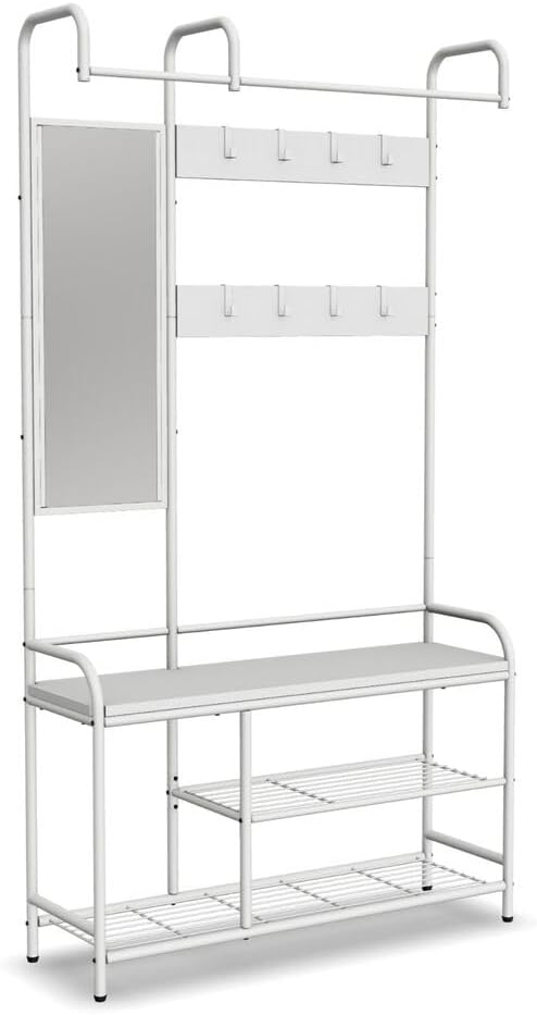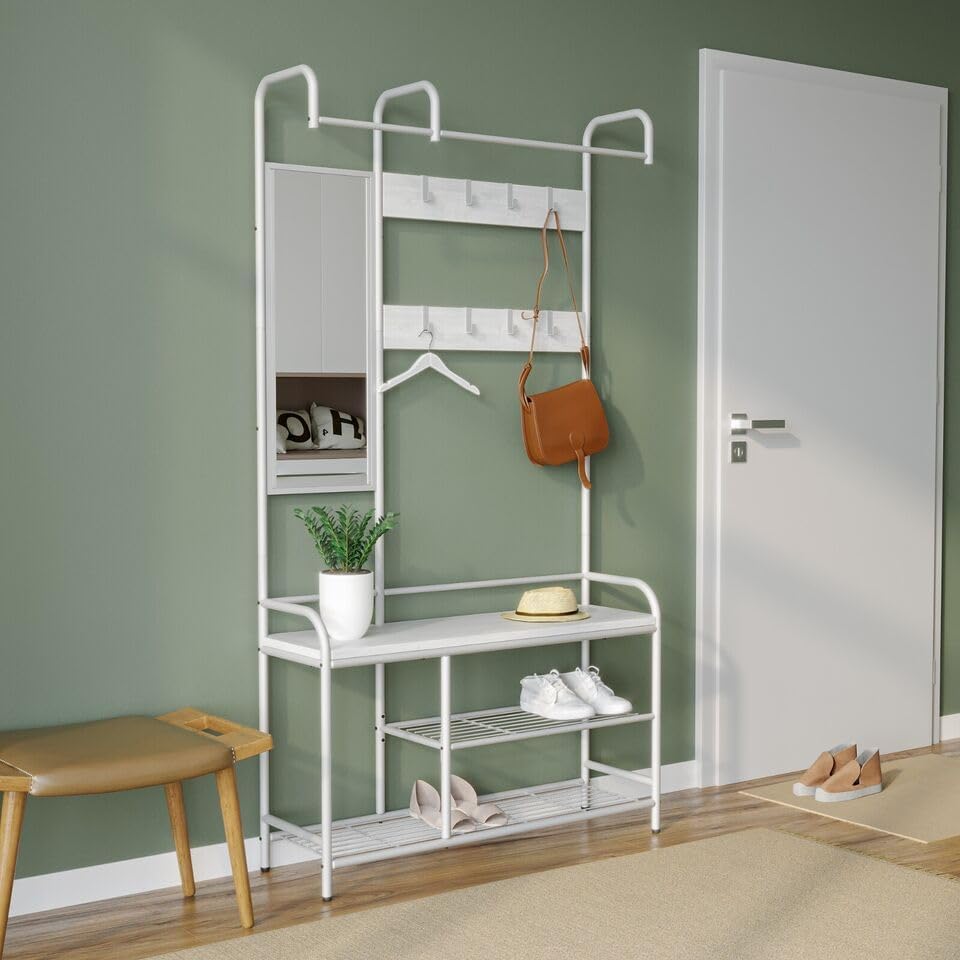 URBNLIVING Entryway Hallway Coat Hanger Stand Shoe Bench Storage Display Rack Mirror Included Stylish Organization for Coats, Shoes, and Accessories Perfect for Entryways and Hallways