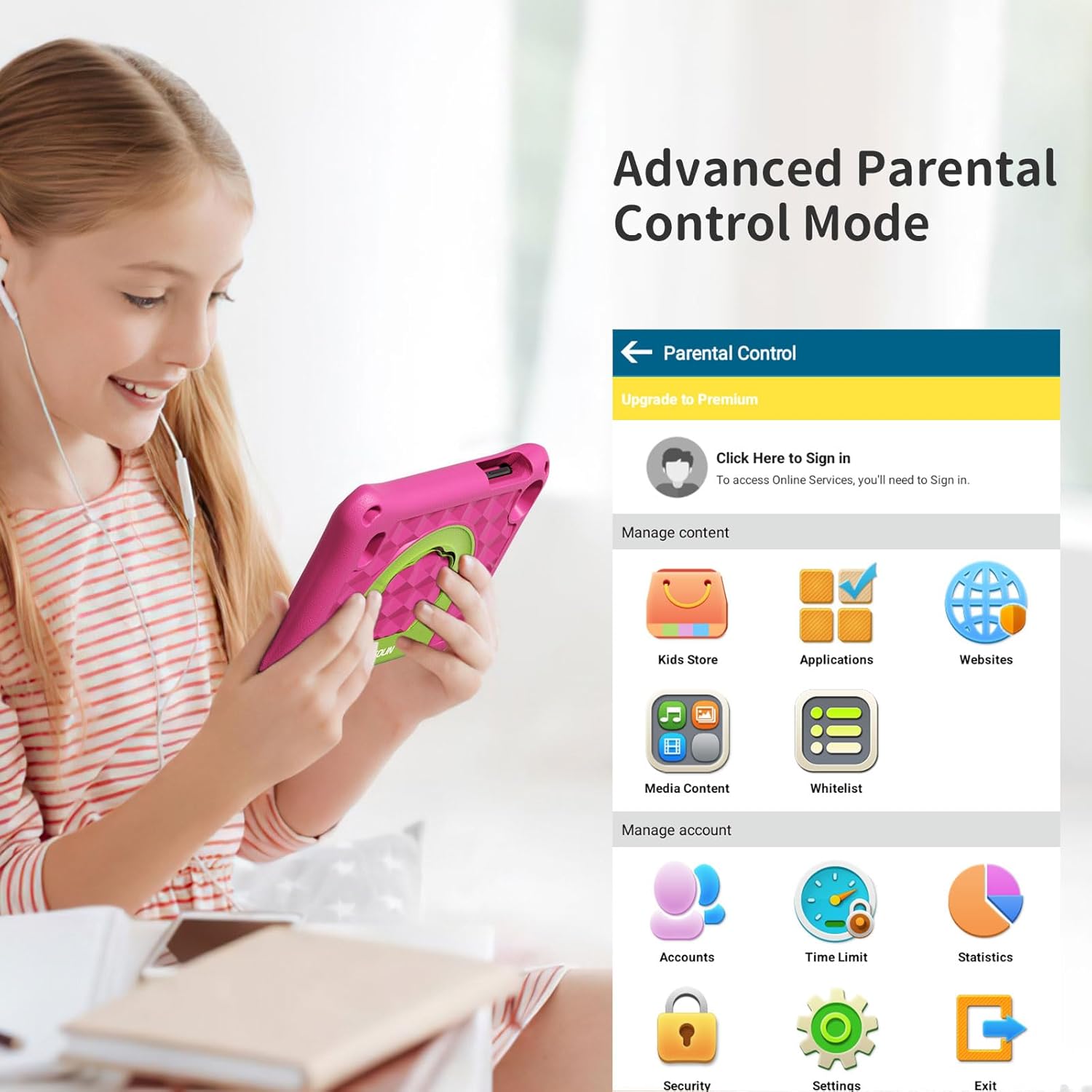 Kids Mode & Adult Mode: Please tap the iWawa app to get into the Kid Mode, enter the Password to exit kid mode or go to the Parental Control interface. (When you launch the child mode, the tablet can be used ae a normal tablet)