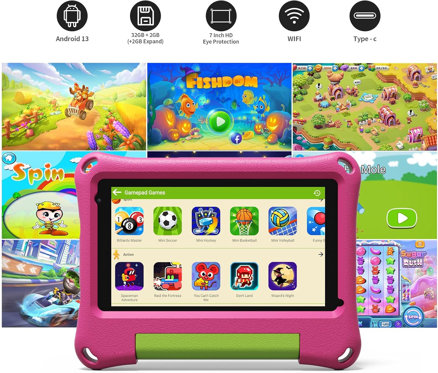 Android 13 Tablet 32GB – M7K Tablet has a built-in powerful quad-core processor and Android 13 OS, 2 GB RAM and 32 GB ROM. It has a 1024 x 600 IPS HD display, WiFi, and come with BT, FM, dual camera, you can use it as a normal tablet when you leave the kids mode. The tablet for kids runs smoothly, it can provide a learning and play time, and your children do not occupy your phone and reduce your own trouble.