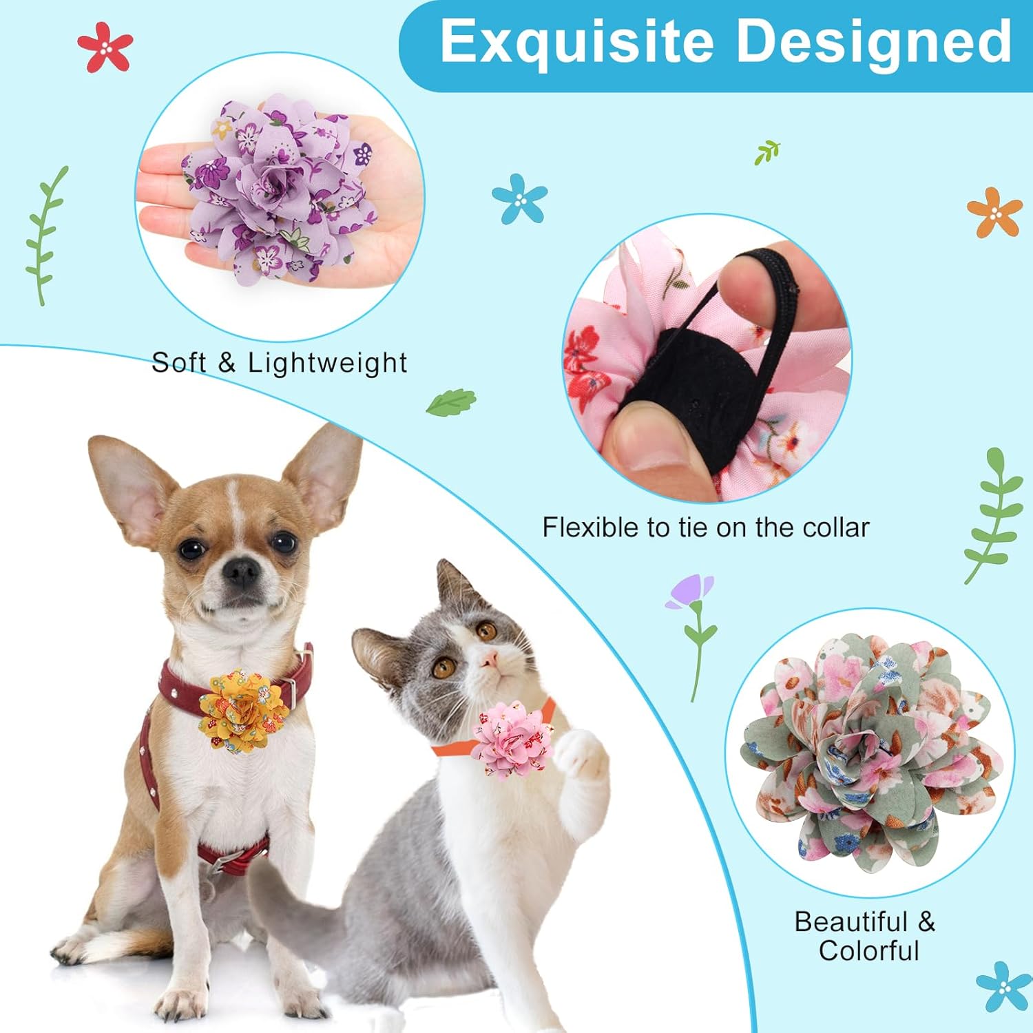 【Elastic and Beautiful】: Dog collar flower attachment set are about 3.15 inch / 8 cm, not only suitable for hanging on most types of pets collar, but also be used as other decorations, with elastic band design and can be directly put on the pet collar, easy to fix and remove