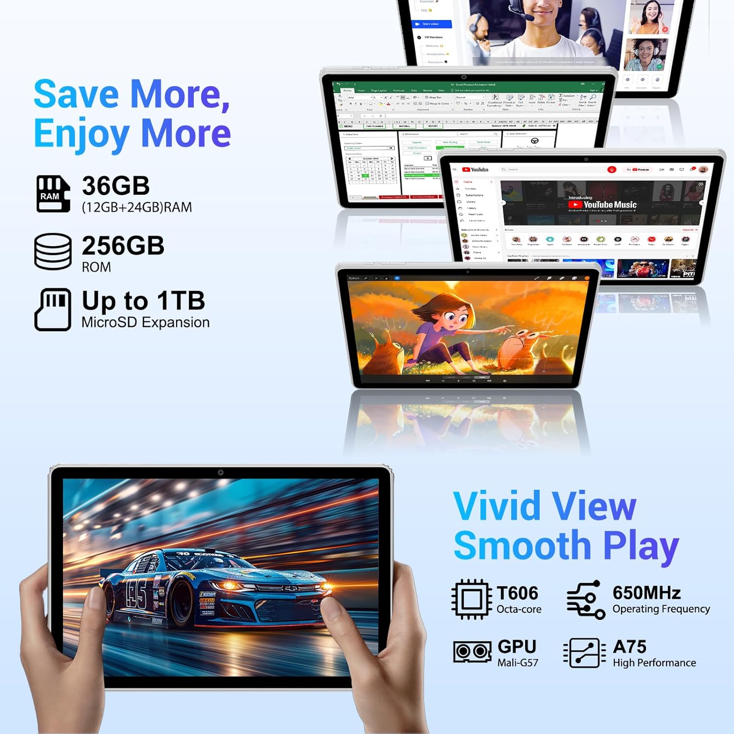 🔥【Latest Android 15 OS & Powerful Performance】Experience smooth multitasking and gaming with the Unisoc T606 Octa-Core processor and Mali-G57 GPU. The Android 15 tablet offers enhanced privacy controls, split-screen mode, and a 90Hz refresh rate for ultra-fluid visuals.