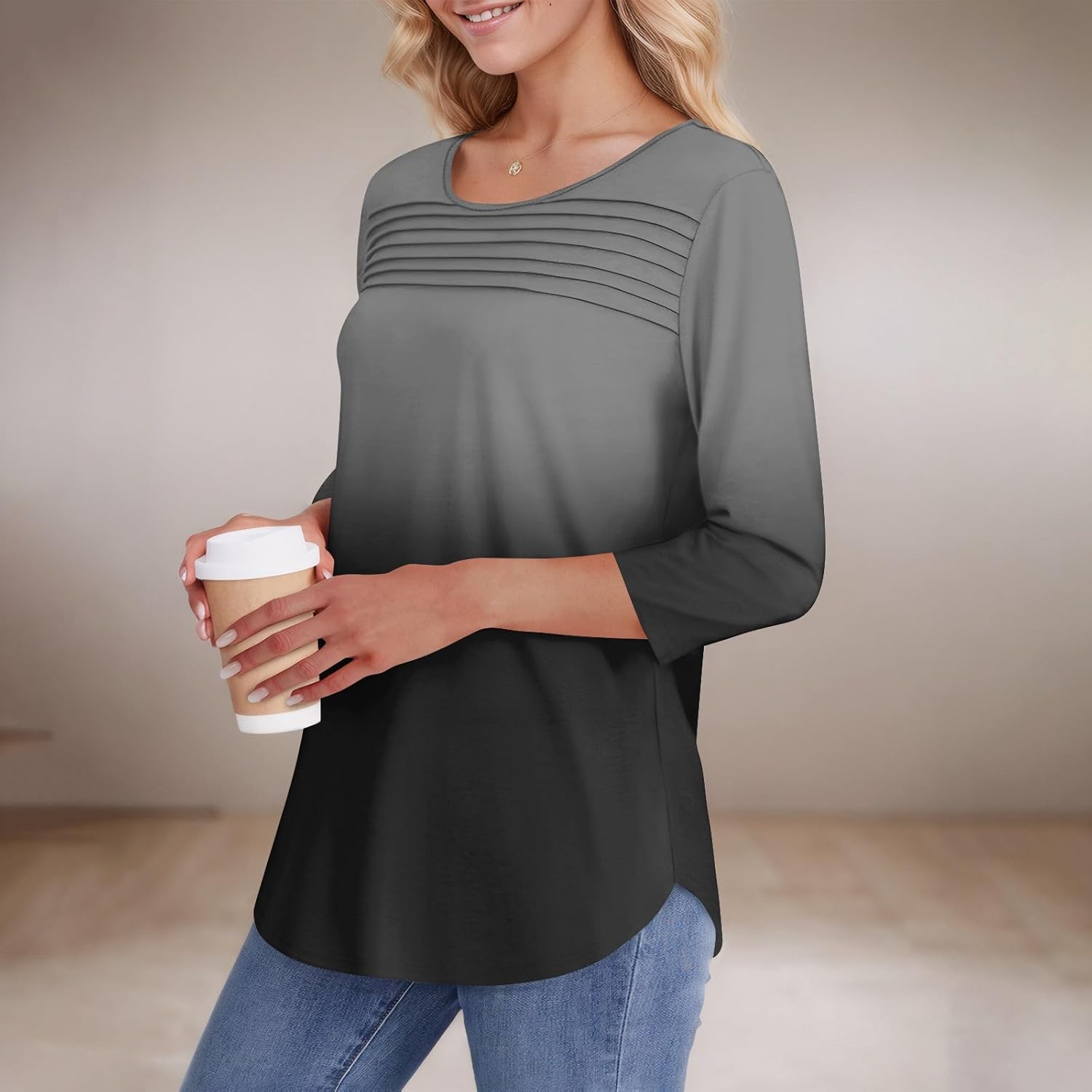Women’s Shirts Crew Neck Blouses 3/4 Sleeve Long Shirt Elegant Tops Pleated Front Tunic Modern T-Shirts Dressy Curved Hem Blouse Loose Tee Casual Tops Gradient Blouse Fashion Print Sweatshirt