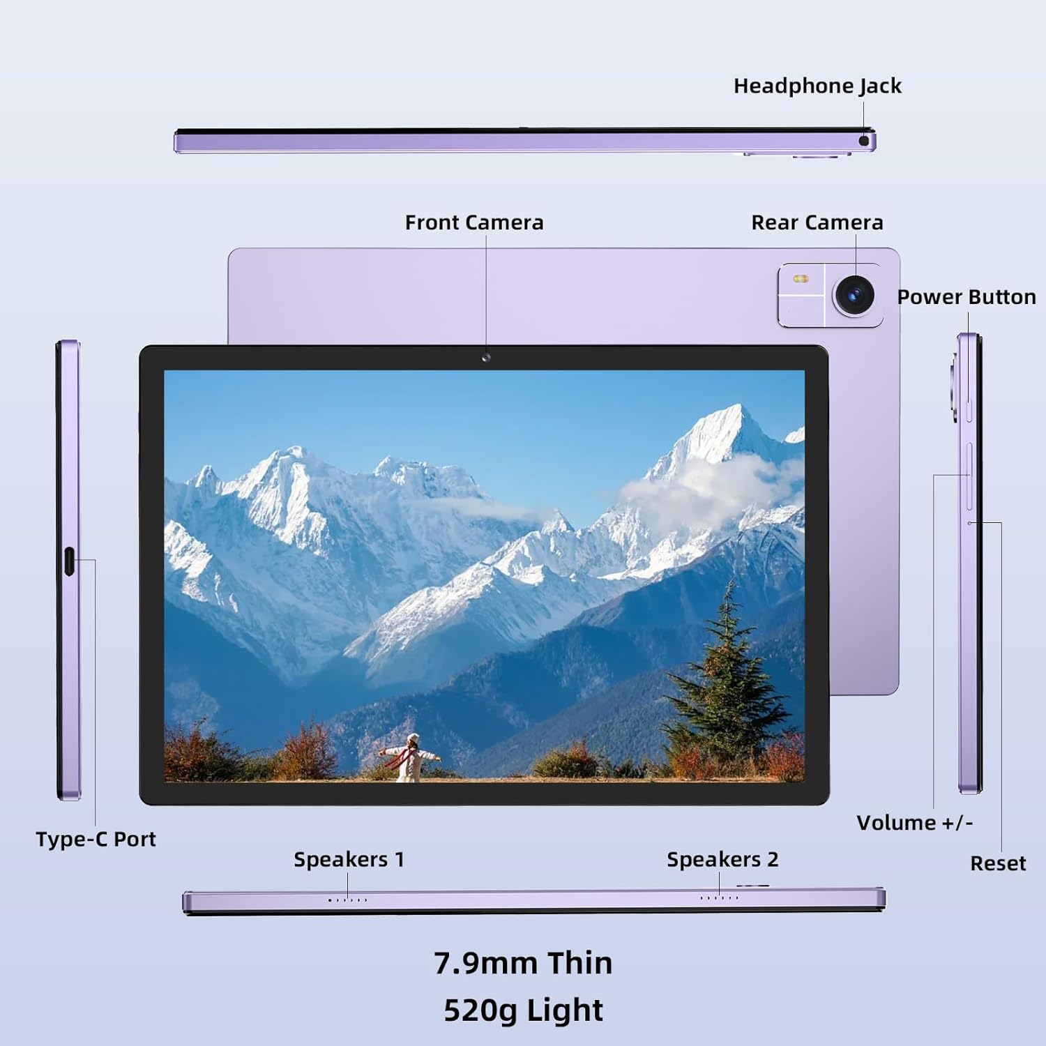 Portable Tablet: Our Android tablet is equipped with 10000mAh battery, large capacity, durable, high endurance, can last 8-10 hours of reading, listening, browsing, watching movies, and playing games, you can enjoy your leisure and entertainment time to your heart’s content. And the Android Tablet PC features a lightweight and slim design, 8mm thin body, weighing about 520 grams, all metal body, exquisite appearance, which is very portable and comfortable to hold, making it easy to use outdoors or on the go.