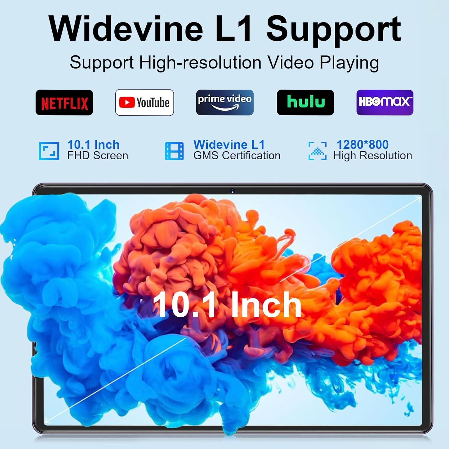 【10 inch + Widevine L1】Tablets has an 10 inch FHD screen with a full angle display, making it a feast for your eyes. Whether you are a dedicated fan or someone who loves binge-watching shows, you can enjoy the latest Widevine L1 certified content on Netflix, YouTube, HBO, or Amazon Prime Video Support L1 high-definition playback . And the Tablet display can accurately adapt to any lighting environment according to your needs, providing effective protection for your vision.
